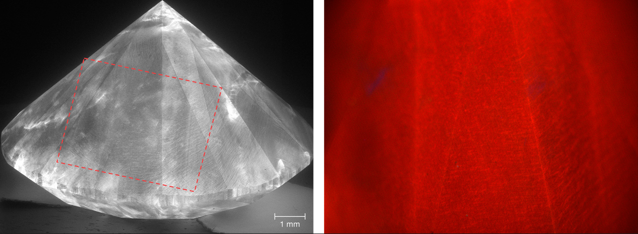 Recently, GIA tested a few thousand laboratory-grown diamonds manufactured by Plasmability. The sizes ranged from about half a carat to more than 10 carats (figure 1). Approximately 85% were colorless, with the rest being near-colorless. Clarity grades varied from VS to VVS. Deep-UV fluorescence imaging is an effective technology for studying diamond growth history, since different growth sectors or growth interruptions will create discontinuities in fluorescence features. Deep-UV fluorescence images collected using the DiamondView were inspected for several hundreds of samples. They were dominated by red–orange emission from NV0 centers, with irregular patches of dislocation bundles, associated with blue band-A fluorescence (figures 2 and 3). No growth layers were observed for tested samples, confirming that they were produced by a single growth step. Excluding the dislocation bundles, the fluorescence was homogeneous, evidence that remarkable control was maintained over the various CVD conditions, including temperature, gas composition, pressure, and power throughout the growth period. Any fluctuations in these parameters would otherwise lead to detectable changes in impurity uptake, typically resulting in interfaces parallel to the growth plane. Complementary cathodoluminescence imaging of a selection of the largest diamonds confirmed these observations (figure 3). A review of gem-quality CVD laboratory-grown diamonds submitted to GIA to date weighing 8.00 ct or more has shown that fewer than 1% were grown without interruption, the largest being a 10.13 ct J-color specimen by Plasmability (figures 1 and 3).