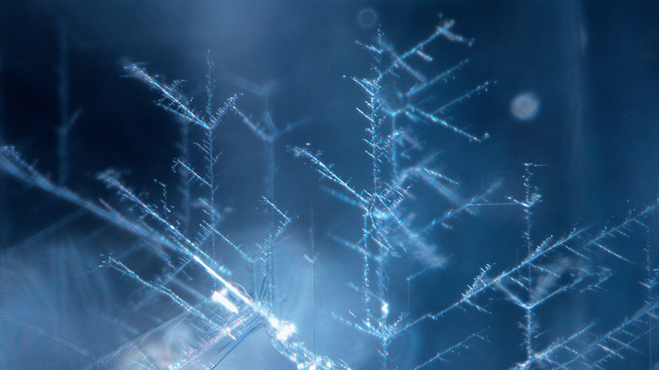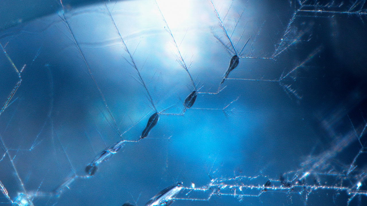 The stone contained unique dendritic inclusions resembling the encasing of a tree in ice, known as rime ice, along the c-axis (figure 1). The “trunk” was parallel to the direction of the c-axis, and the “branches” extended from the trunk at approximately a 60° angle. On the other side, a lightning-strike pattern was observed (figure 2). Specific Raman spectra were not detected from these inclusions, suggesting they may be a kind of hollow channel within the crystal. Similar internal features have been observed in Namibian materials and were likely formed by the “step” growth of jeremejevite crystals (Scarratt et al., 2001; “Jeremejevite: A description of a 400 crystal collection from Namibia and a preliminary study of five color types,” GIA Research News, 2009). Crystal growth can create attractive patterns such as these unique inclusions in jeremejevite.