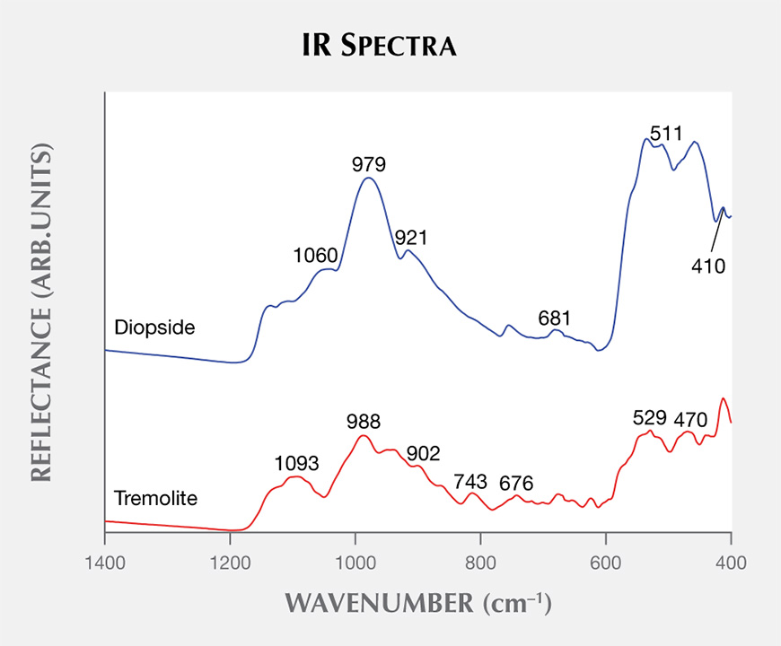 Tremolite and diopside are common gem materials in the jewelry trade. Both occur in nephrite, where tremolite is the main mineral and diopside is an accessory mineral. This was the first time we had encountered diopside rather than tremolite as the major mineral when both occurred within the same sample.