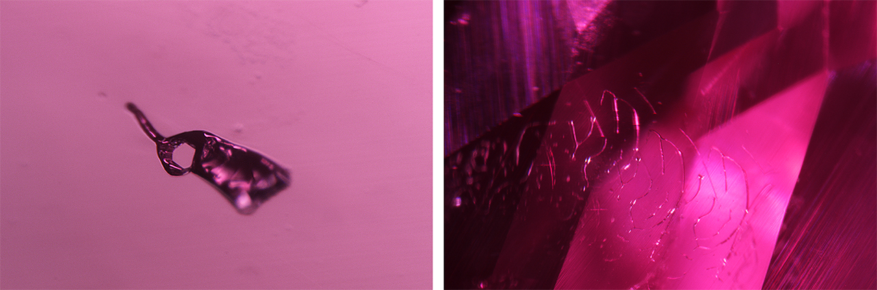Microscopic examination revealed further evidence of a synthetic origin: a single reflective platinum platelet with negative hexagonal growth through the center (figure 1, left). Also observed were interconnected channels of exsolved flux creating fingerprints (figure 1, right).