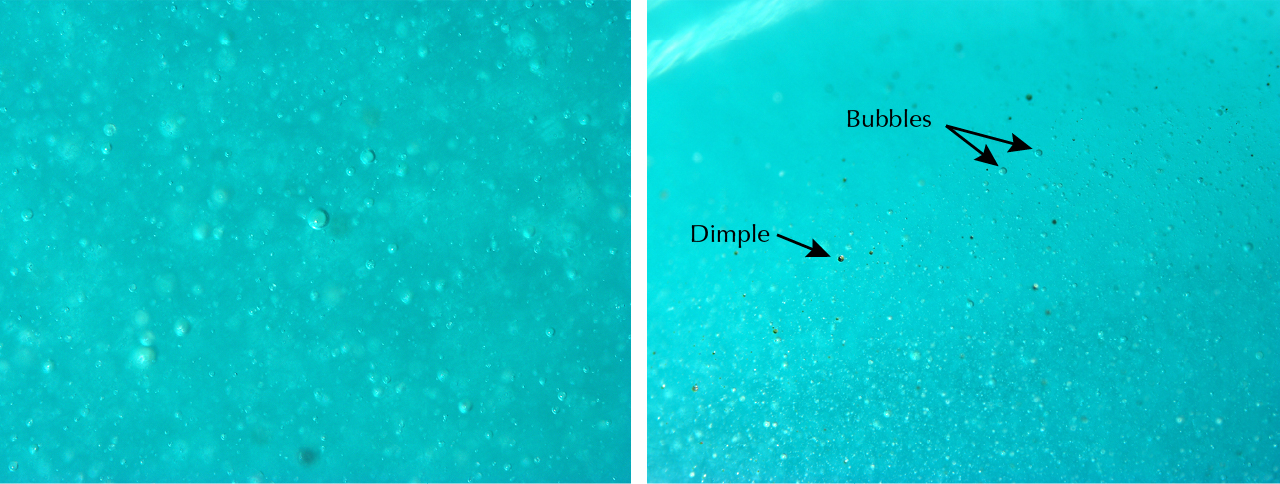 Standard gemological tests showed the following properties of the three samples: color—uniform greenish blue; diaphaneity—translucent; spot RI—1.48; SG—2.48 to approximately 2.57; fluorescence—inert to long-wave UV radiation, weak greenish white to short-wave UV radiation. Actual gem silica, meanwhile, has the following properties: color—commonly uneven; spot RI—1.54; SG—approximately 2.63. Examination with a gemological microscope revealed numerous obvious gas bubbles of different sizes (figure 2, left). In the case of the marquise sample, numerous gas bubbles led to a relatively low specific gravity. When viewed with oblique incident light, many small dimples were visible on the polished surface (figure 2, right). In addition, there were some small conchoidal fractures along the bottom edges of samples. In order to gain a more thorough understanding, further advanced analysis was carried out.