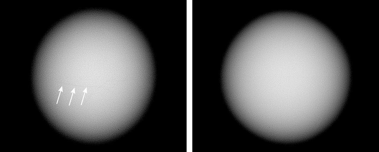 Microradiography revealed no obvious internal growth structure (figure 3). Only the fine crack previously mentioned showed as a dark fine line in the correct orientation (figure 3, left, indicated by the white arrows). The absence of any surface modification and the presence of natural surface features, in addition to the lack of banded structure typically observed in shell samples, proved this was a pearl and not an imitation fashioned from Melo shell (Summer 2006 Lab Notes, pp 166–167; N. Sturman et al., “An imitation Melo pearl,” GIA Research News, https://www.gia.edu/gia-news-research/imitation-melo-pearl, 2011).