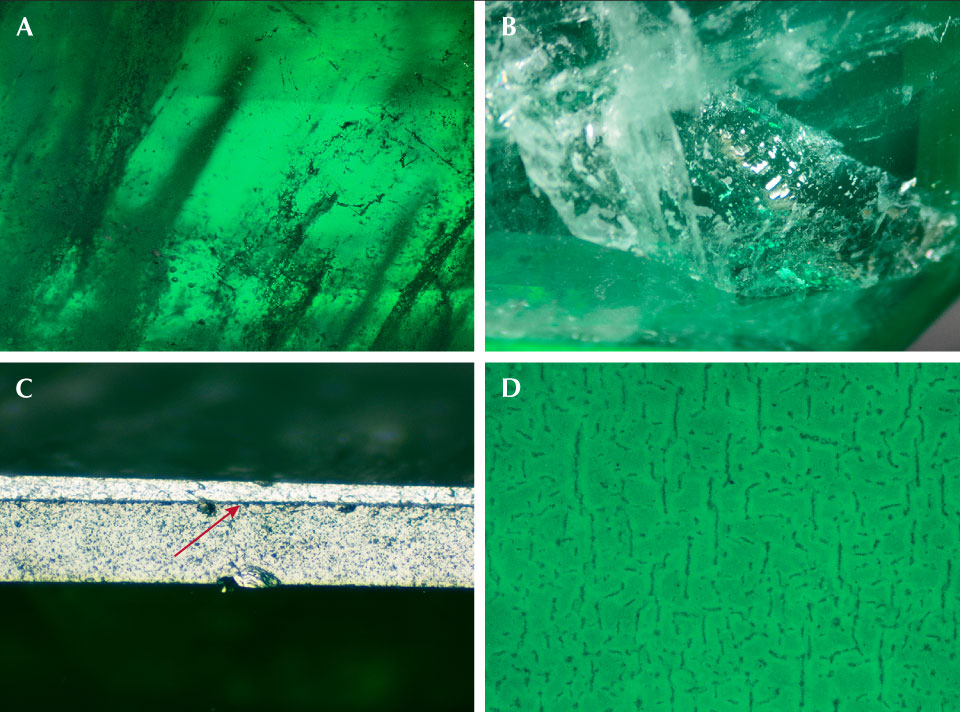 When examined via water immersion in a direction parallel to the girdle plane, one can observe that this triplet was made of two pieces of colorless material (crown and pavilion), with a green cement slice in between (figure 2). Using water for the immersion test to observe the internal characteristics did not corrode the sample and yielded better experimental results. No inclusions were observed in the crown. Microscopic examination revealed two-phase (liquid and gas) inclusions, cracks (figure 3A), and lace-like partially healed fissures in the pavilion (figure 3B). In the middle cement layer, no gas bubbles were observed along the separation plane in the assemblage, unlike doublets previously described (H.A. Hänni and U. Henn, “Modern doublets, manufactured in Germany and India,” Journal of Gemmology, Vol. 34, No. 6, 2015, pp. 479–482; Spring 2019 Lab Notes, p. 92). However, the very thin layer of solidified cement (approximately 10 μm thick; figure 3C) showed a maze-like pattern under the microscope (figure 3D).