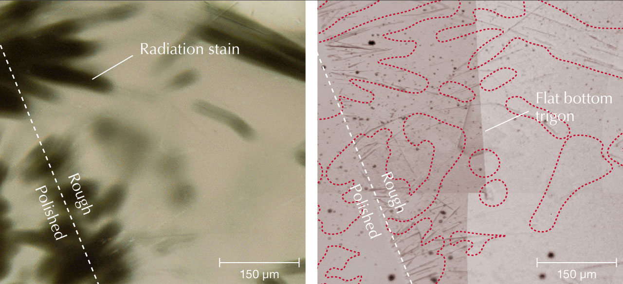 It is unusual to see green radiation stains of this shape that correspond with indentations on a diamond surface. These features could be a commonly overlooked characteristic of green diamonds.