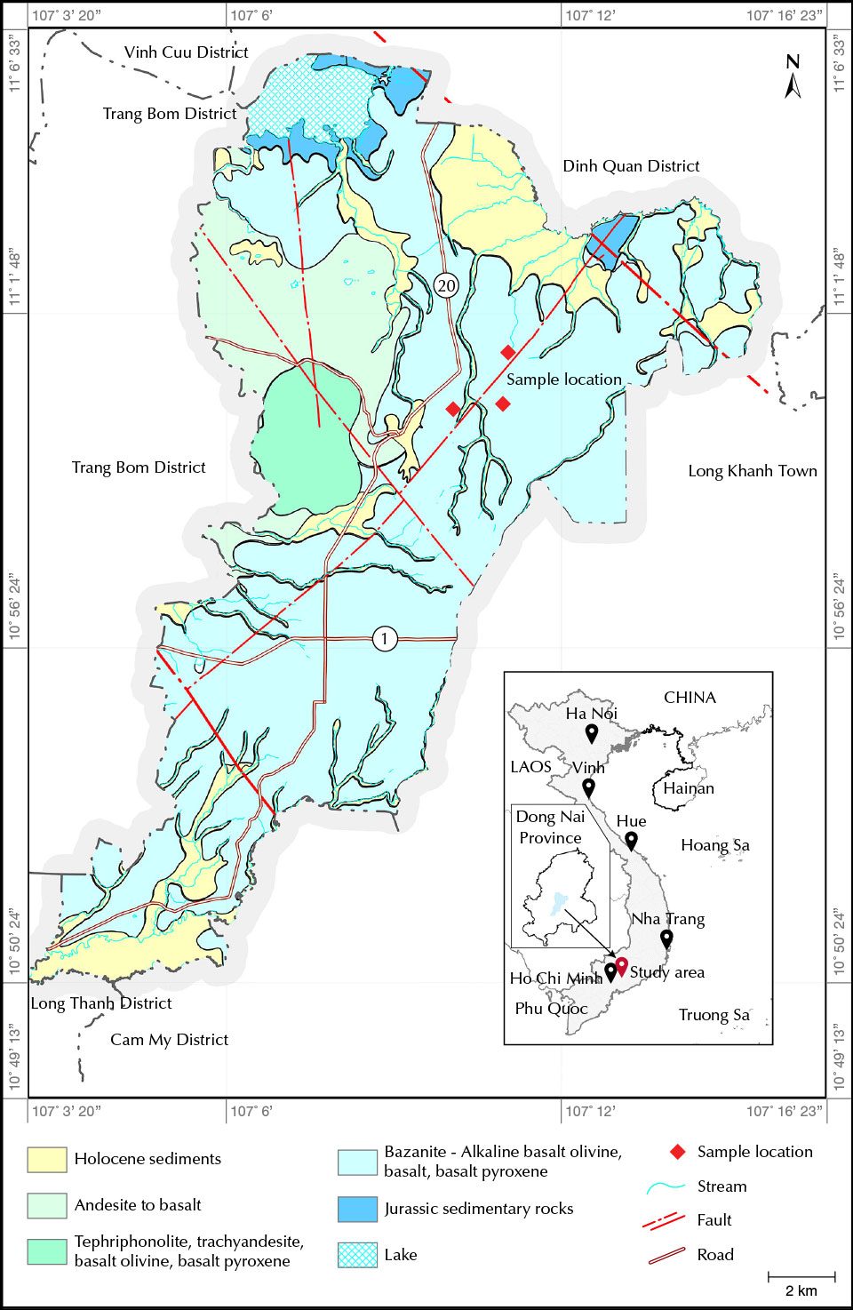 The augite deposit is located in the center of Gia Kiem commune in the Thong Nhat district of Dong Nai Province (figure 3) in the southeast region of Vietnam, about 90 km north of Ho Chi Minh City. In May 2020 and October 2021, we conducted field trips to this area to collect samples and investigate the site. The sampling site is in the midland, a transition zone between the plains and the highlands. From the north, the terrain descends gradually toward the south, and temporary streams and springs carve through rolling hills. The average elevation is about 139 m above mean sea level, with the slope steepness varying from 30° to 80°. Landforms include a plain of denudation and cinder cones (Son et al., 2005; Bac and Bao, 2020). The plain of denudation occurs on Jurassic sedimentary rock, with the erosion surface dating to the Late Pliocene to Early Pleistocene, before the eruption of the basaltic lava that covers almost the entire erosion surface (Bac and Bao, 2020). The study location in Dong Nai is centered on a dormant volcano zone that was active during the period from the Neogene to the Quaternary (Bac and Bao, 2020) (again, see figure 3). The regolith is quite thick, containing mostly red and gray soils and sometimes basaltic boulders. Due to the area’s tropical climate, mechanical weathering also causes exfoliation on most of the bedrock.
