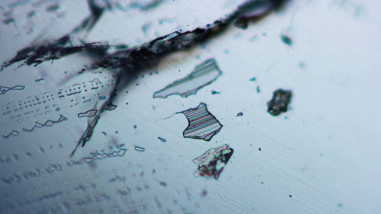 The aquamarines contained yellow-brown to black-brown inclusions. Microscopic observation and further Raman analysis confirmed that these dot-like, flaky, and dendritic yellow-brown to black-brown inclusions were hematite. Interestingly, when observed with a microscope using LED white light illumination, the hematite inclusions appeared to extend from the center to the periphery, and the overall hexagonal shape resembled a rose floating on a calm sea (figure 1).