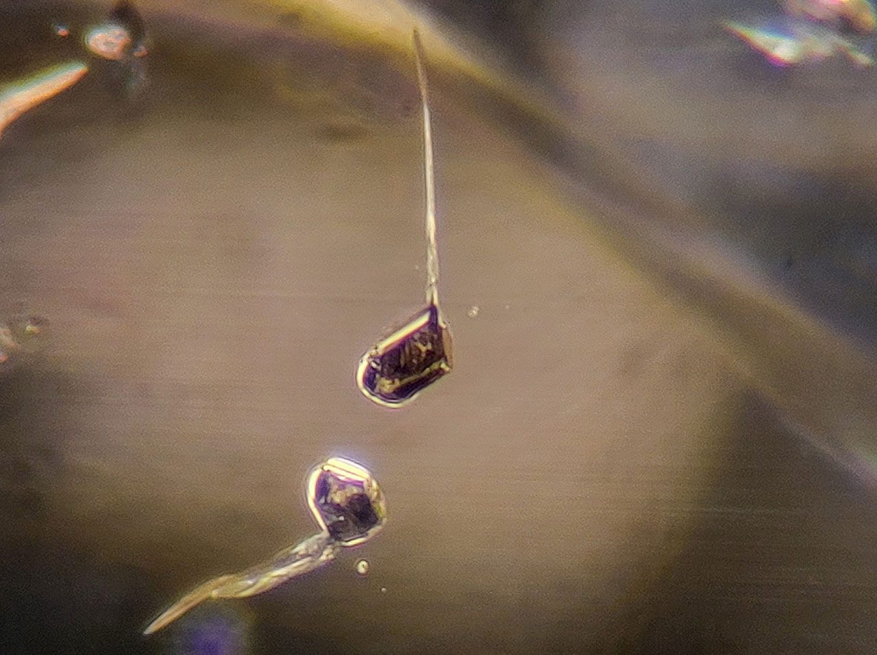 A crystal with a stress halo and a smaller adjacent crystal resembles a dotted quarter note. Several reflections of such crystals with stress fractures are visible. Photomicrograph by Michaela Damba; field of view 2.90 mm.