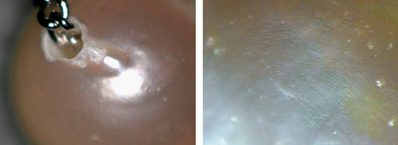 The 8.20 × 8.01 × 7.92 mm pearl had a white bodycolor with pink overtone and was fully drilled with an approximately 1 mm drill hole. The bead was observed through the drill hole. A bumpy surface near the drill hole (figure 2, left) resulted in the pearl’s semi-baroque shape. Nacre and terrace structures were observed on the surface (figure 2, right). The pearl’s saltwater chemistry was confirmed by EDXRF. Its luster was excellent, and the surface was clean. The pearl fluoresced weak bluish yellow under short-wave UV and moderate bluish yellow under long-wave UV. The fluorescence feature indicates that the pearl had been subjected to a routine set of traditional processes for improving the appearance of cultured pearls (R. Shor, “From single source to global free market: the transformation of the cultured pearl industry,” Fall 2007 G&G, pp. 200–226). The nacre thickness was measured by optical coherent tomography (OCT), a nondestructive technique for cross-sectional imaging of various materials, including pearl and jade (J. Liu et al., “Pearl thickness measurements from optical coherence tomography images,” Applied Mechanics and Materials, Vol. 421, 2013, pp. 415–420; S. Chang et al., “Detection and analysis of jade material using optical coherence tomography,” Photonics North 2010, Vol. 7750, 2010, SPIE). The center of the pearl was round with a homogeneous nacre thickness of 0.35 mm ± 0.01 mm (figure 3, left). Toward the drill hole, the thickness was uneven, with some bumpy areas in the thinnest part measuring ~0.23 mm (figure 3, right). Although the quality was very good, the shape was not round and the size was less than 8 mm, which is probably why this pearl became a prize in the claw game.