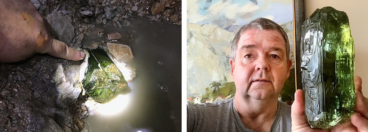 These pockets are often filled partially or completely with secondary clays (figure 11), so miners use a pointed hand tool such as a screwdriver to gently probe the clay to detect if crystals are present (figures 12 and 13). Once a pocket is located, the contents are carefully removed by hand, and the clay-coated crystals are washed—only then does the miner know what exactly has been found. Crystals may still be attached to the pocket walls or lie as broken pieces on the pocket floor. Besides recovering individual gem crystals, efforts are made to extract attractive rock matrix specimens with the crystals still attached. Careful trimming and cleaning of matrix pocket specimens are often required.
