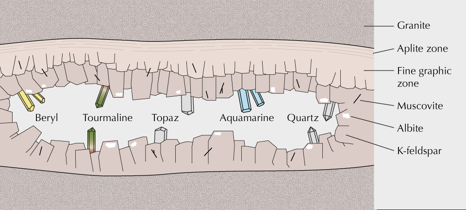 Some of the finest gem crystals and specimens from the mineral kingdom originate mainly and sometimes solely from complex, internally zoned pegmatites (Simmons et al., 2012). These gem minerals occur most often in open (or clay-filled) pockets in the core and central zones of the pegmatite body (figure 10). With diameters typically from centimeters to a meter or more, these pockets are more easily located in a thinner pegmatite dike but can be difficult to find in a thicker one.