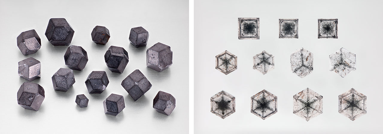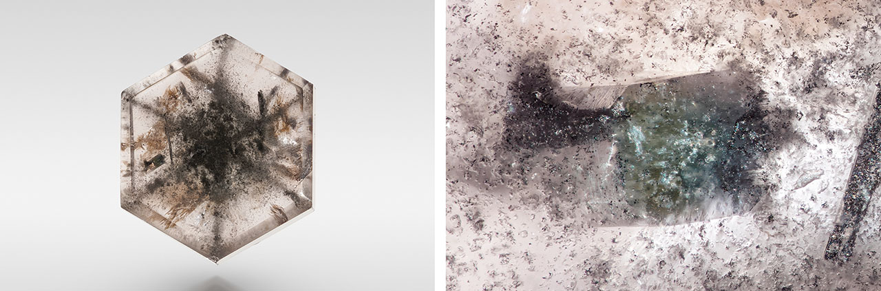 The grossular crystals were collected from a skarn outcrop in southwestern Hangzhou. The formation of skarn is the result of contact metamorphism between granite and limestone. The grossular crystals (figure 1, left) were in the form of rhombic dodecahedrons and appeared black due to a coating of graphite and pyrite. When cut into slices (figure 1, right), they exhibited a colorless and highly transparent appearance. Scanning electron microscopy with energy-dispersive spectroscopy (SEM-EDS) and laser ablation–inductively coupled plasma–mass spectrometry (LA-ICP-MS) analyses indicated their compositions were close to the grossular endmember, with trace amounts of magnesium, titanium, vanadium, chromium, manganese, and iron.