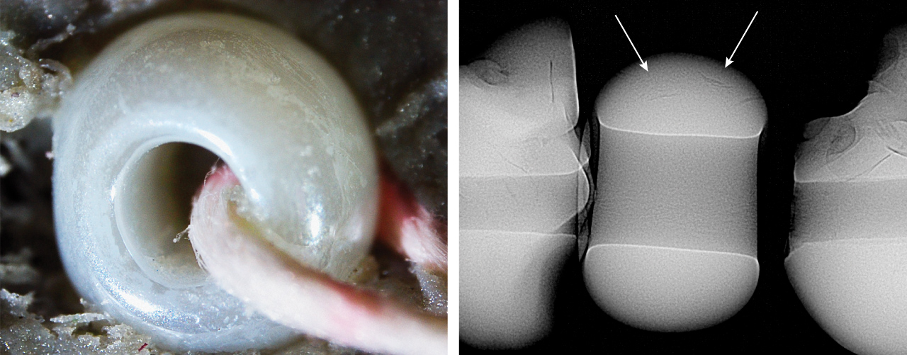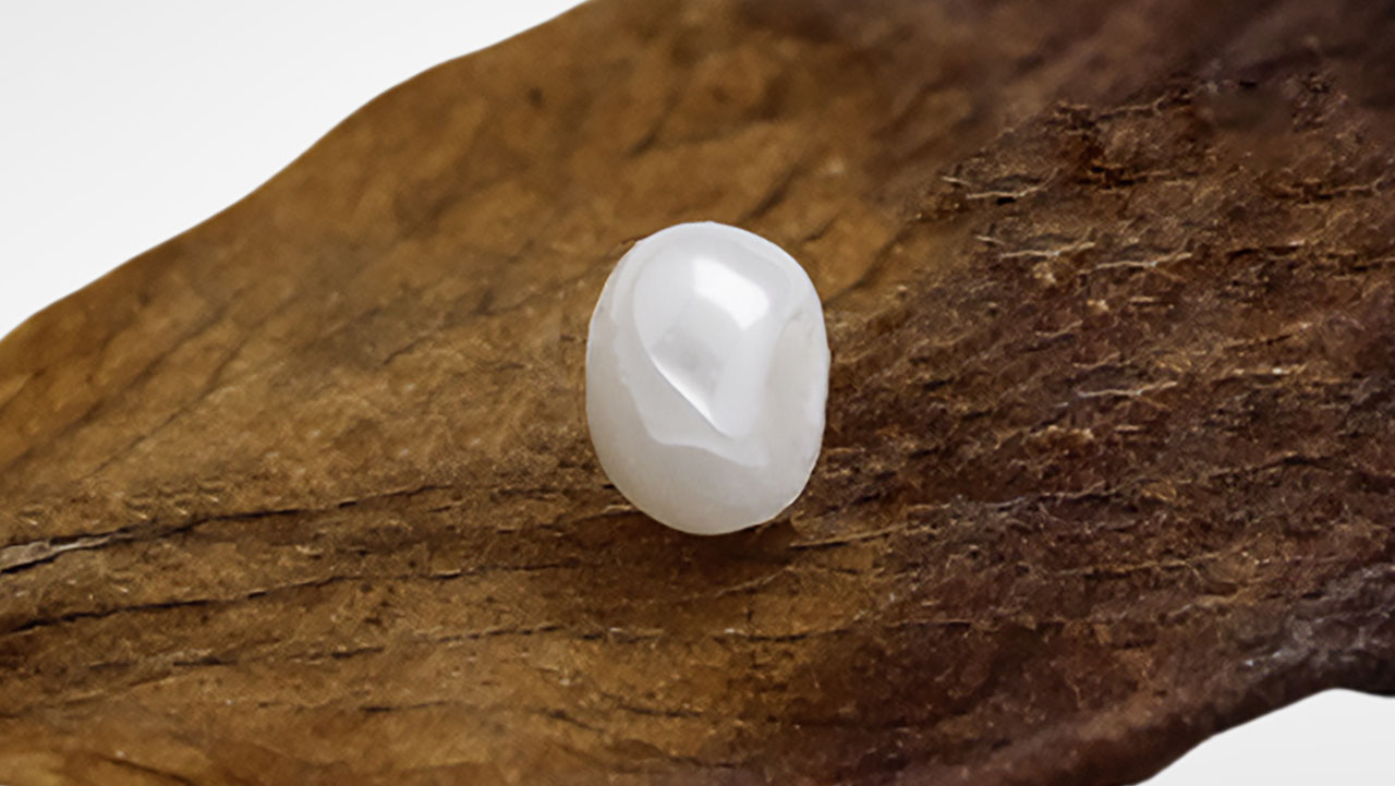 GIA’s Mumbai laboratory recently received a submission of 18 strands of pearls for identification, consisting of approximately 9,360 white to light cream pearls weighing a total of 706.79 carats. When subjected to X-ray fluorescence, most of the pearls were inert, indicating a saltwater origin, while a few exhibited the strong yellowish green fluorescence of freshwater pearls. Notably, one white oval “pearl,” measuring approximately 1.70 × 1.12 mm and weighing 0.01 ct (figure 1), displayed a unique moderate blue reaction upon X-ray exposure (figure 2)—an effect not previously observed in saltwater or freshwater pearls. The “pearl” was visually similar to the other submitted pearls, but its extremely large drill hole raised suspicion (figure 3, left). Under higher magnification, its smooth surface lacked characteristic nacreous overlapping aragonite platelets, displaying a unique liquid-like surface residue instead. This “pearl” appeared inert under long-wave ultraviolet light, while other pearls were greenish yellow. Additionally, it exhibited a light yellow reaction under the deep-UV wavelength (<225 nm) of the DiamondView, unlike the typical blue reactions observed in pearls. Raman spectroscopy with different laser excitations did not reveal any distinctive features indicative of calcium carbonate polymorphs typically found in pearls. Based on these findings, it was concluded that the material in question was not a pearl but rather an imitation. Real-time X-ray microradiography (RTX) indicated that, with the exception of the one imitation, the 18 strands contained a mixture of natural and non-bead cultured pearls. Interestingly, the imitation displayed a similar radiopacity to the other pearls. A few arcs were present at the outer edges, comparable to growth arcs observed in the adjacent natural pearls strung in the strand (figure 3, right).
