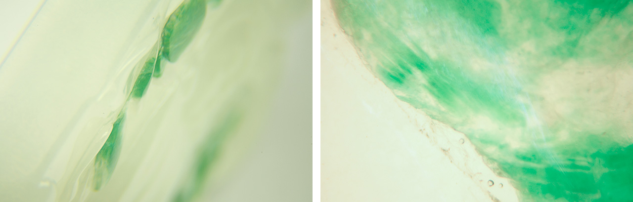 The background color and texture quality of the small plate attachments was similar to those of the main jadeite body, creating a harmonious overall appearance (again, see figure 1). The green color appeared to be floating on the surface and seemed to be detached from the base (figure 2, left), whereas the natural color zone of jadeite always changes gradually. Resin with accompanying bubbles was found in the space between the green attachments and the jadeite body (figure 2, right). Under the long-wave UV lamp, the resin in the contact region emitted strong blue-white fluorescence while the body did not fluoresce (figure 3).