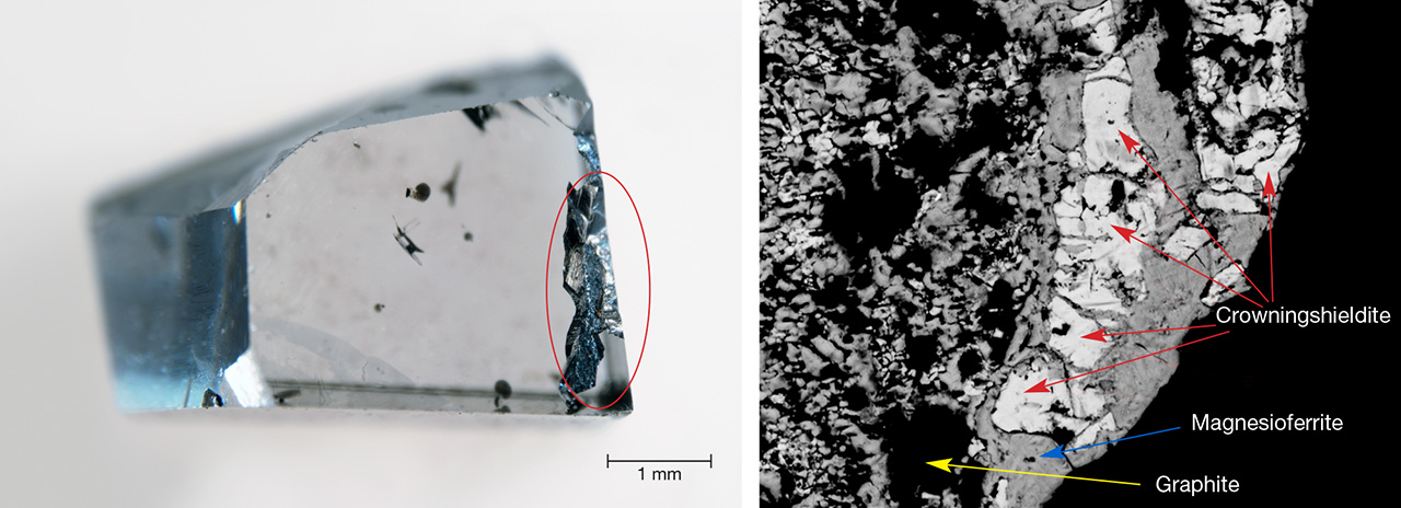 GIA, in collaboration with researchers at the University of Padova, recently discovered crowningshieldite (figure 1), a new mineral named in honor of G. Robert Crowningshield (1919–2006), a pioneering researcher at GIA for more than 50 years. His many landmark contributions included the detection of irradiated diamonds, the initial report on General Electric’s facet-quality synthetic diamonds, and the description of “padparadscha” sapphire’s orangy pink to pinkish orange color. Crowningshieldite is a nickel sulfide mineral with a hexagonal crystal structure and can be regarded as the high-temperature polymorph of the mineral millerite. Discovered as an altered inclusion in two diamonds from the Letšeng mine in Lesotho, it was accepted as a mineral on September 18, 2018, by the International Mineralogical Association.