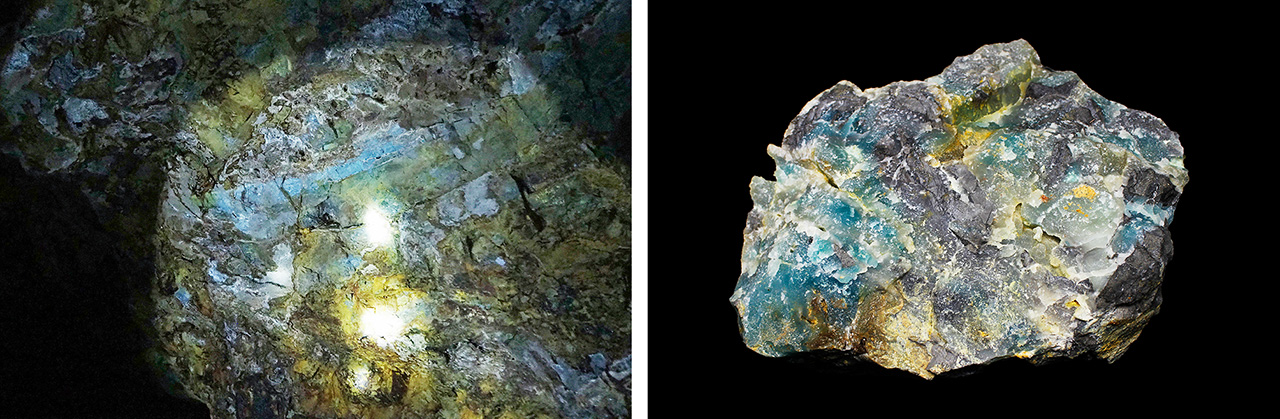 The authors observed that in the mine, this material has a close relationship with stibnite. It is mostly developed in the interlayer fissures, fracture zones, and areas where brecciation has taken place. The material occurs as blocks and/or veins (figure 3). In the ores, there are calcite- and gypsum-filled cracks and voids. Green or white clay minerals are often found in the micro-cracks or small holes in the gem material.