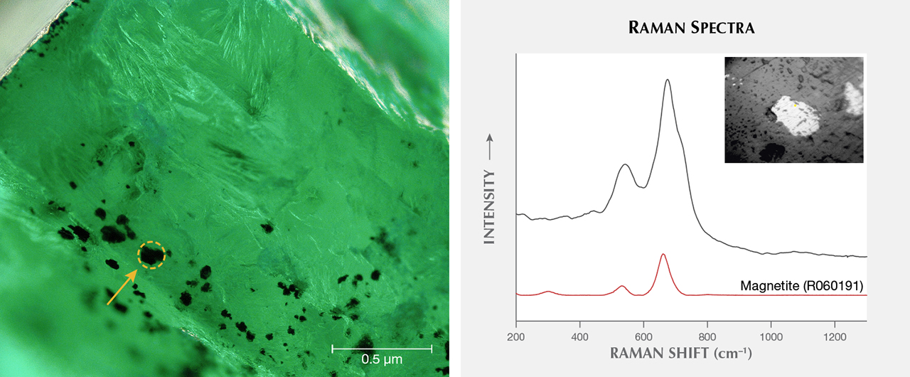 Very few mineral species have been identified as inclusions in this emerald—these include feldspar (plagioclase) (S. Saeseaw et al., “Three-phase inclusions in emerald and their impact on origin determination,” Summer 2014 G&G, pp. 114–132; S. Saeseaw et al., “Geographic origin determination of emerald,” Winter 2019 G&G, pp. 614–646) and to a lesser extent tourmaline, mica, scheelite, and fluorite (D. Marshall, “Geological work,” InColor, Spring 2009, p. 29). Black rounded crystals were observed in some of the Davdar emeralds we studied. Previous studies noted the presence of black minerals as well but did not identify them (S. Saeseaw et al., 2014, 2019). We revealed the black mineral to be magnetite via Raman microspectrometry (figure 1). This is potentially the first time magnetite has been identified in Davdar emeralds, though it has been identified in emeralds from other regions (referenced above). Magnetite as a black iron oxide inclusion is commonly seen in emeralds from Zambian and Brazilian localities and other schist-hosted origins (again, see Saeseaw et al., 2019).