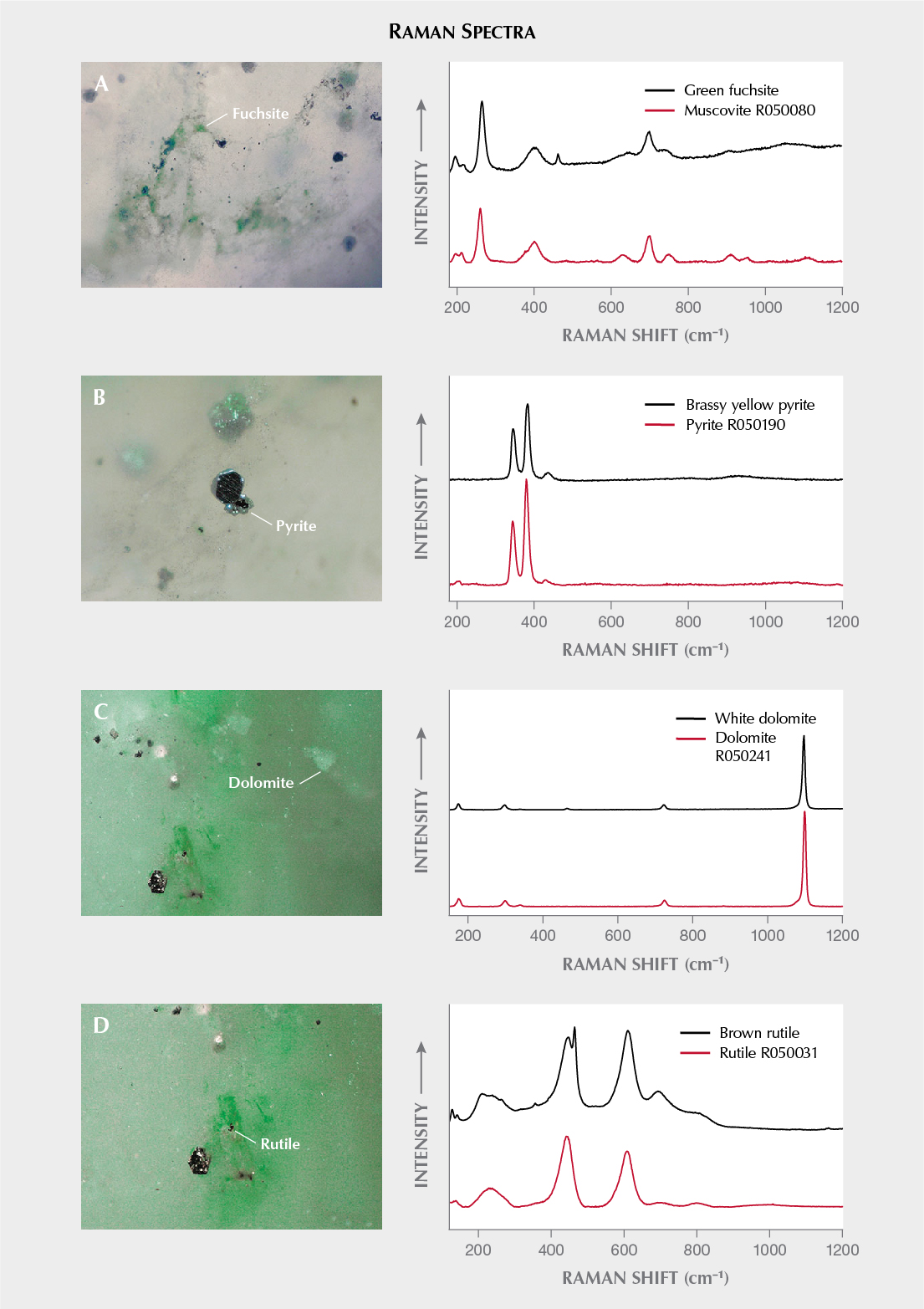 These green flaky inclusions were slightly oriented. Raman combined with EDXRF analysis identified them as fuchsite (K(Al,Cr)2(AlSi3O10)(OH)2), a green chromium-colored variety of muscovite (figure 3A) (Fall 2013 GNI, pp. 183–184). Additionally, brassy yellow inclusions in a range of sizes were confirmed as pyrite (figure 3B) using Raman spectroscopy. Raman also identified some white blocky inclusions in a nearby area as dolomite (figure 3C), as well as some tiny brown rutile inclusions found as irregular, randomly scattered grains (figure 3D).