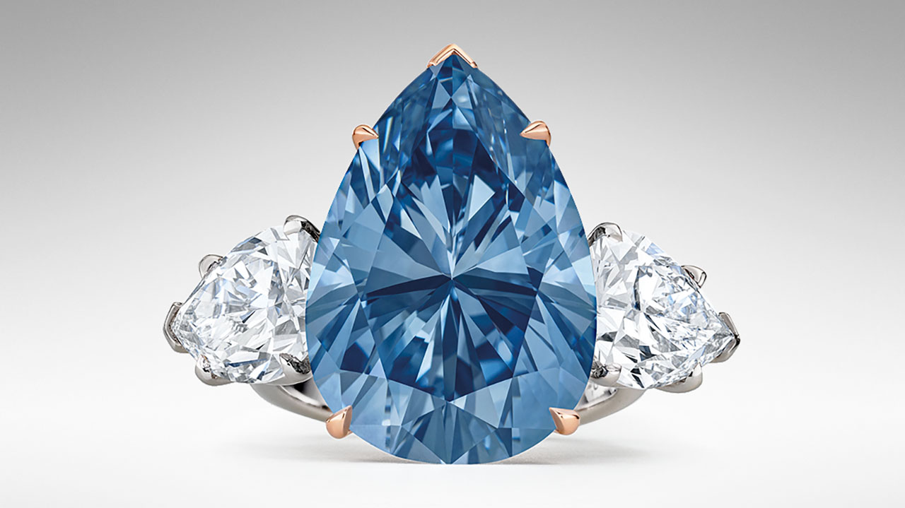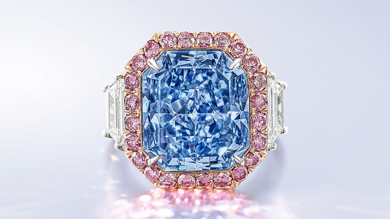 In early October, Sotheby’s kicked off the season with a single-lot sale of the 11.28 ct “Infinite Blue” (figure 1) in Hong Kong. Celebrating its 50th year in Asia, the auction house offered the Fancy Vivid blue type IIb diamond from the Cullinan mine in South Africa set in a ring with a pink diamond halo and colorless diamond side stones. With GIA’s highest color grade for a blue diamond, the ring sold for $25.3 million, just below the low end of its presale estimate.