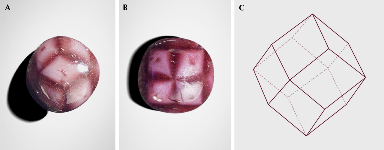The garnet group contains the most gem-quality species for jewelry manufacturing. Phenomenal garnets such as almandine and pyrope species are also known for their four- and six-rayed asterism. Nevertheless, the trapiche structure found in emerald, ruby, sapphire, tourmaline, and quartz is extremely rare in garnet. This structure can be considered an immobile star phenomenon. Inclusions and color zoning are responsible for the formation of two-, four-, or six-arm trapiche patterns.