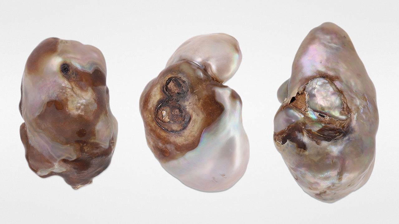 Despite the possibility of these three being large blister pearls, closer examination of them did not reveal any indications of previous attachment to the shell such as signs of heavily worked or sawn areas (“Natural shell blisters and blister pearls: What’s the difference?” GIA Research News, August 26, 2019). The lack of such features indicated they were whole pearls. The few small organic-rich areas visible on the pearls’ surfaces (figure 3), along with the non-nacreous and nacreous surfaces, were possibly damaged because the organic-rich material weakened over time.