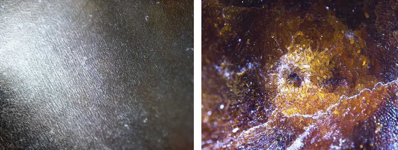 Visual observation revealed a combination of nacreous and non-nacreous surface structures. The pearls were white to light gray and brown and exhibited a strong orient with variations in saturation and tone. In some areas, their surface quality was poor to slightly damaged. Viewed under 40× magnification, the white to light gray areas displayed a striated and much finer form of nacre growth structure than observed in most nacreous pearls from Pinctada and Pteria mollusks (figure 2, left). The dark brown areas showed a characteristic non-nacreous cellular structure consisting of a network of closely packed cells (figure 2, right). These observations were consistent with previous studies (N. Sturman et al., “Observations on pearls reportedly from the Pinnidae family (pen pearls),” Fall 2014 G&G, pp. 202–215).