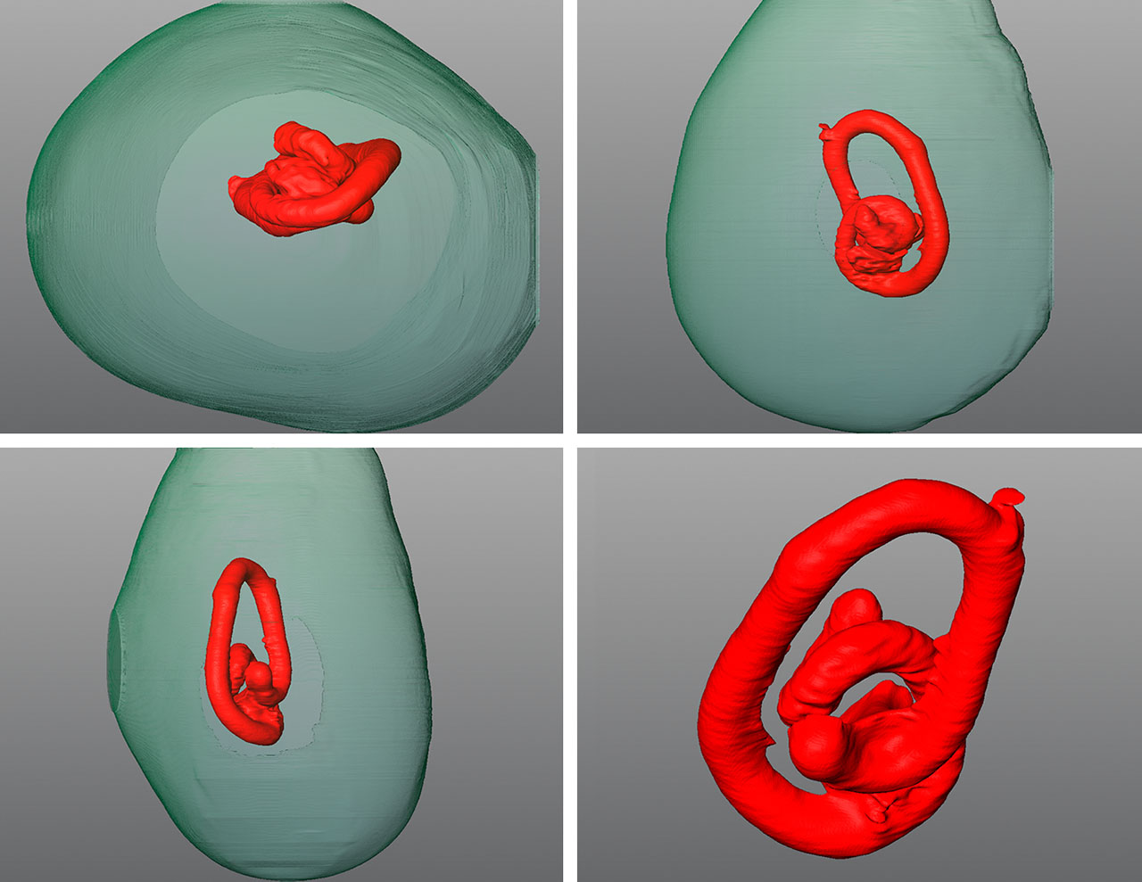 To further study this tubular feature, three-dimensional models were created using specialized software to render the μ-CT scan images (“New 3-D software expands GIA’s pearl identification capabilities,” GIA Research News, May 13, 2016). The results from these models clearly showed that the central structure consisted of an elongated twisted tube. Based on the tubular formation presented, the feature is suspected to be formed by a burrowing parasite trapped in the center of the pearl (figure 4; see video below). Parasites of various types have been observed in both saltwater and freshwater bivalves, and certain worms have been known to use bivalve mollusks as their hosts. Notably, marine bivalve mollusks tend to be more prone to parasitic intrusions than freshwater mussels (E. Strack, Pearls, Rühle-Diebener-Verlag, Stuttgart, 2006, p. 116). Therefore, the presence of such tubular features in saltwater pearls indicates the potential infiltration of worm larvae into the mollusks’ mantle. These larvae—either dead, alive, or hibernating—may have subsequently become encapsulated by the mantle epithelial cells, leading to the formation of a pearl sac and eventually the creation of a pearl.