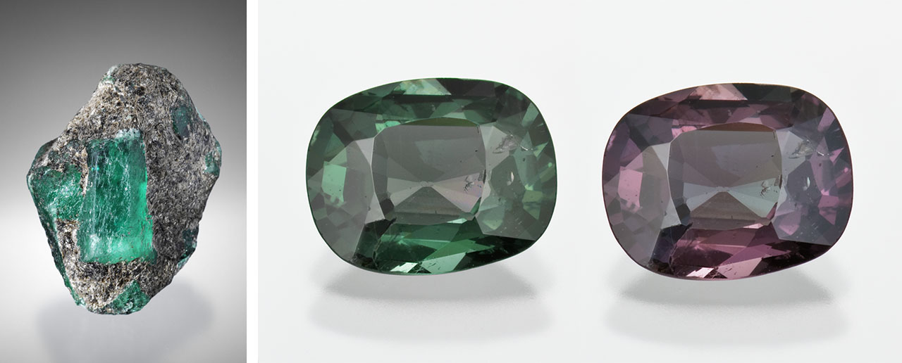 The emerald and alexandrite deposits in the Ural Mountains in Russia near Ekaterinburg provide a relevant geological example. Emerald was first discovered here in the 1830s, and later the color-change variety of chrysoberyl, alexandrite, was found and described from the same region (figure 6). Although there are several historic deposits in the area, mining mainly occurs at the Mariinsky-Priisk (formerly Malysheva) mine where emerald is the primary product, with some alexandrite produced as a byproduct. Anecdotal evidence indicates that some deposits were more well known for producing emerald and some more known for alexandrite. While the phase diagram in figure 5 may not exactly correspond to the conditions of formation here, it can serve as a general explanation for how deposits like this form multiple different gem species. Figure 5 indicates that only very special geochemical conditions would allow for both alexandrite and emerald to be produced at the same time, and those conditions exist right along the boundary between the emerald (beryl) and alexandrite (chrysoberyl) fields. Once on that boundary, pushing the concentrations of SiO2 or Al2O3 in either direction will cause either emerald or alexandrite to become unstable, leaving only one of these gems to be formed. It is likely that variations in the chemical conditions from one location in these pegmatite-related, schist-hosted deposits to another resulted in zones of both emerald and alexandrite. The same geological forces were also at play at Lake Manyara in Tanzania, which is mostly known as an alexandrite deposit but also produces emerald. Additionally, recent anecdotal evidence also suggests that some Brazilian emerald mines have started producing small amounts of alexandrite, and the same geological forces may be responsible in those cases.