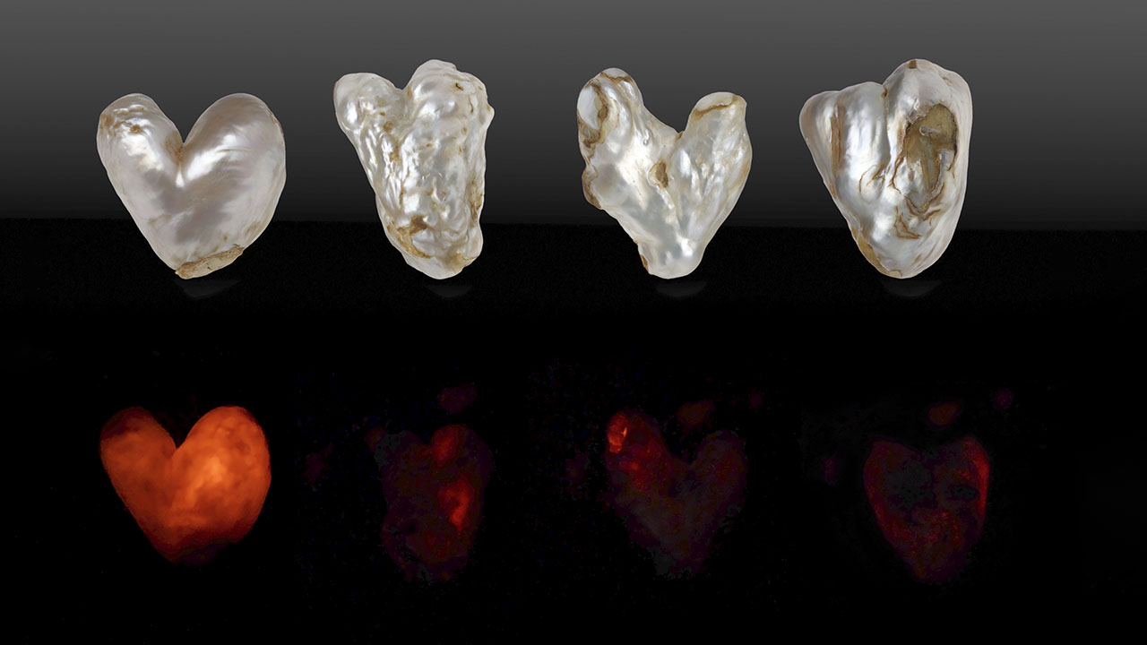 Recently, the Mumbai laboratory received a parcel of loose white to light cream baroque pearls identified as filled natural hollow saltwater pearls after visual and chemical examination. Four of these pearls exhibited notable heart-like shapes and an unusual red X-ray fluorescence (figure 1).