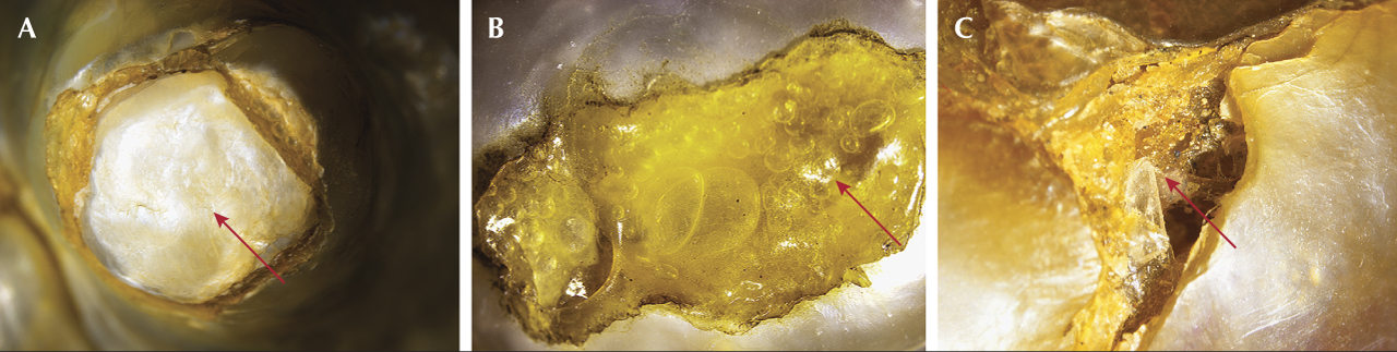 The four pearls ranged from 22.47 × 22.00 × 15.73 mm to 35.46 × 27.27 × 24.22 mm in size and weighed 34.30, 52.75, 75.86, and 98.53 ct. They appeared worn and fragile, and their heft slightly exceeded the typical weight for pearls of similar size (Winter 2022 Lab Notes, pp. 480–481). Their surfaces were characterized by significant cracks, grooves, and plugged areas. When viewed under higher magnification, all four pearls revealed areas that were sealed with a piece of shell, bonded together using a yellowish brown resinous adhesive (figure 2A). This adhesive was visible within the cracks and fissures and contained trapped air bubbles (figure 2, B and C). While some surface areas exhibited an overlapping nacre terrace structure, there was also evidence of working observed near the plugged areas.