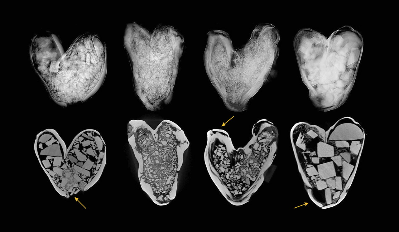 All four pearls displayed evidence of considerable efforts to improve their durability, including cavity filling, plugging, and working their surfaces to smooth the areas around the plugs. However, despite these interventions, the overall shape, external appearance, and internal structures of the pearls indicate their natural origin. The unique shape and modifications applied to certain areas raise a degree of uncertainty regarding whether they are whole or blister pearls. Nevertheless, their distinctive heart shapes, along with their striking red fluorescence, make these pearls particularly noteworthy.