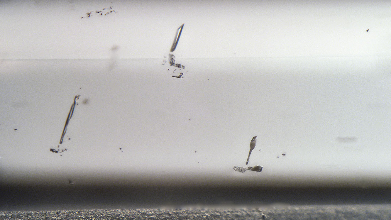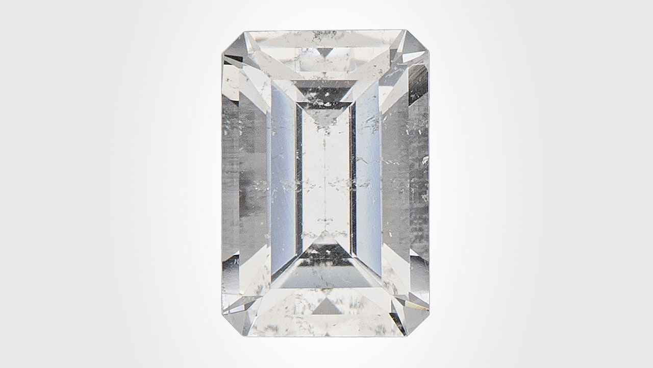 A 0.59 ct near-colorless octagonal step-cut stone was recently submitted to the Carlsbad laboratory (figure 1). Standard gemological testing measured a refractive index of 1.550–1.555 (birefringence of 0.005), a biaxial optic figure, and a hydrostatic specific gravity of 2.77. Microscopic examination revealed negative crystals (figure 2), colorless particles, and a small fingerprint breaking the pavilion surface. These properties were consistent with those reported for armenite. The submitted stone was then compared to a near-colorless armenite reference specimen belonging to the GIA Museum, which showed a similar microscopic appearance along with internal stress fractures. Raman and infrared spectra collected on both stones were a near-perfect match, further supporting the armenite identity of the stone.
