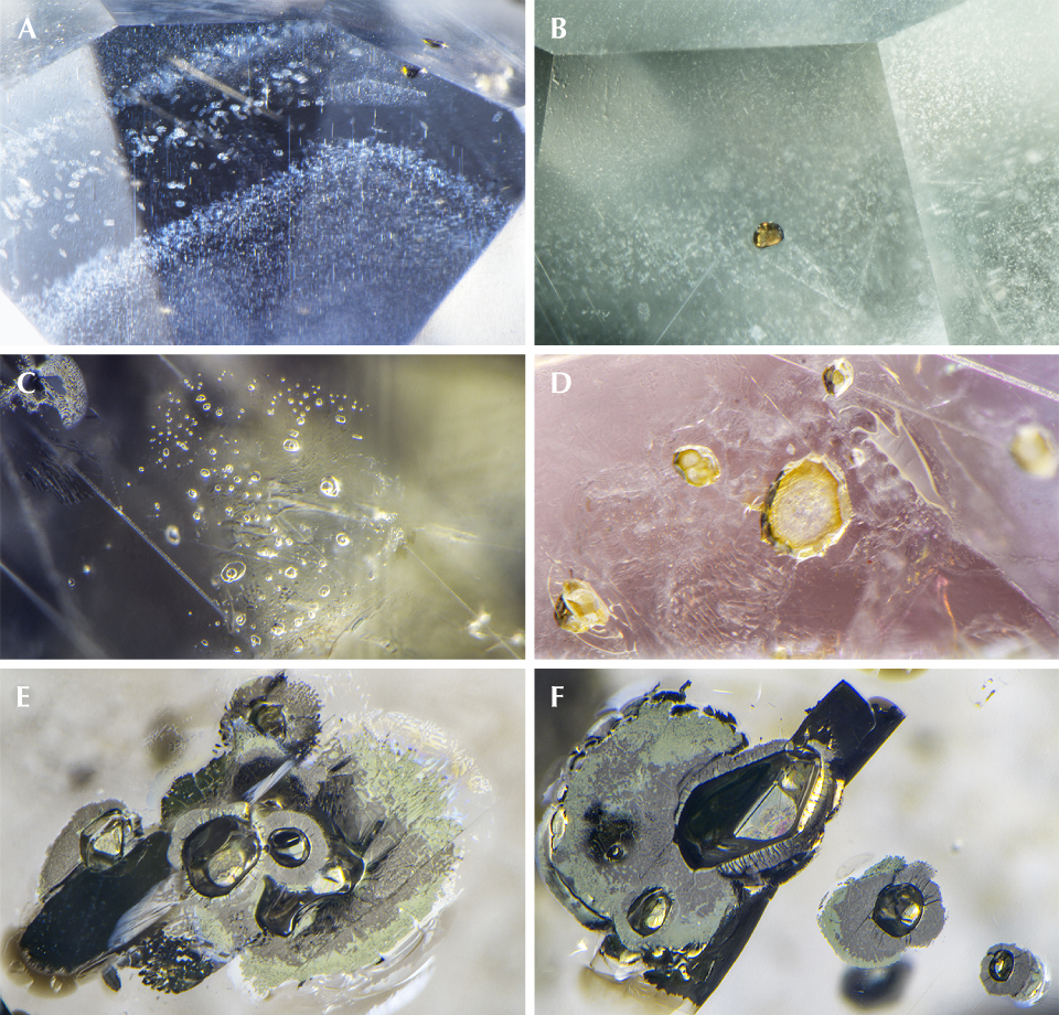 Thin film–type inclusions oriented along the basal growth planes were also a very common feature. These were frequently associated with fine, tabular two-phase negative crystals containing a gas phase and amorphous melt (figure 12C). Such silicate melt inclusions were initially trapped as the corundum formed and were later quenched to a glassy state with a contraction bubble during the eruptive event that brought the stones to the surface with subsequent cooling (e.g., Gübelin and Koivula, 1986; Palke et al., 2017).