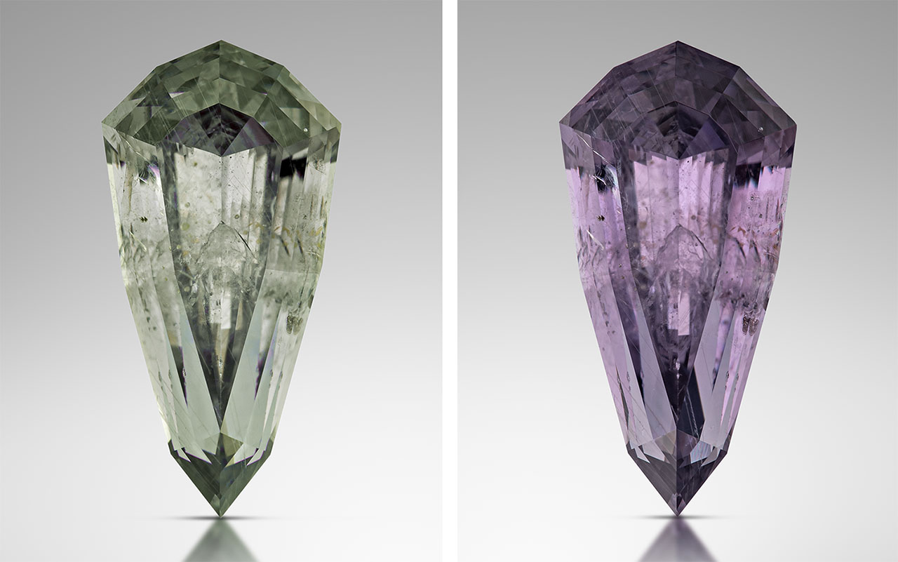French Bar sill sapphires observed thus far by the authors are typically light to medium tones in hues of green, blue-green, blue, green-blue, pink, yellow, and colorless. Some specimens have displayed a color-change phenomenon, shifting from bluish green to pinkish purple (figure 17), while others have exhibited a strong color change from medium blue to blue-violet.