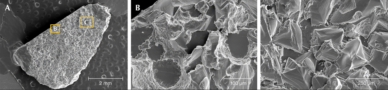 Sapphires with Features Formed by Weathering and Alluvial Action. Small chips on ridges and projections on secondary sapphires are easily visible with low-to-medium gemological magnification but are perhaps best studied by SEM. Most of these tiny chips likely formed when the sapphire crystals were tumbled in the sediment load of the Missouri River rather than in the washing plant, because the crystals were subjected to fluvial action for exponentially longer than they were in the washing plant and jigs. Smooth rounding of the crystals, seen with the unaided eye, is attributed to abrasion during fluvial transport. Of the three secondary deposits, sapphire crystals from the Missouri River’s various alluvial deposits are the only sapphires to display a smooth rounded appearance. Sapphires from Rock Creek and Dry Cottonwood Creek show rounding due to resorption.