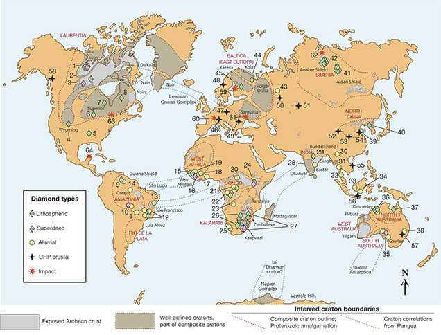 New Perspectives on Diamond Geology. Just as an enormous leap was made in the 1880s with the recognition that diamonds are found in kimberlite, recent advances have been made by putting together high-precision, high-resolution microanalyses of diamonds and their mineral inclusions, radiogenic and stable isotopes, geophysics, and the discovery of diamonds in unexpected new places. Clifford’s Rule, the prospector’s guideline that confines diamondiferous kimberlites to the Archean or oldest parts of the stable cratonic blocks of continental crust, worked well because of fortuitous geologic features. It is not only that the Archean was a special time to form diamonds—we have large numbers of samples formed in the Proterozoic. Rather, it is that in South Africa, the site of early geologically driven diamond prospecting, the craton was formed by an Archean continental collision that produced many diamonds at that time (figure 28). The collision made the mantle keel under the Archean crust deeper and more melt-depleted than the mantle keel under Proterozoic crust. Thus, it was just deep enough and reduced enough to receive much younger diamond-forming fluids created by subduction-related orogenic processes.