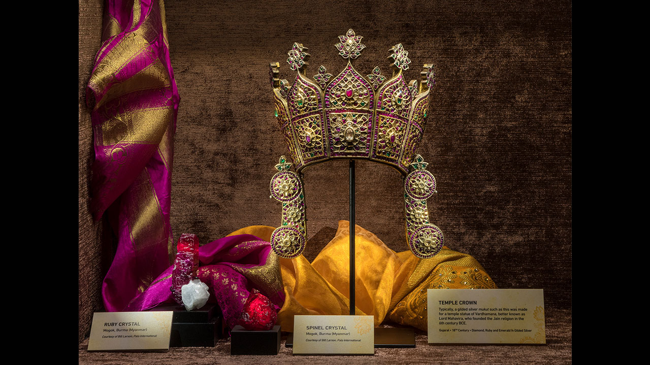 This exhibit features 50 exquisite gemstone jewelry pieces and objects from India on loan from a private collection. Never seen in public, these pieces - including several from the magnificent Mughal Empire (1526–1857) - showcase more than 300 years of adornment from the 17th to the 20th centuries. The exhibit explores the distant sources of the diamonds, rubies, emeralds, sapphires and other gems decorating these pieces, their religious and cultural symbolism, the wars fought for them and the historical tradition of gemology in India.