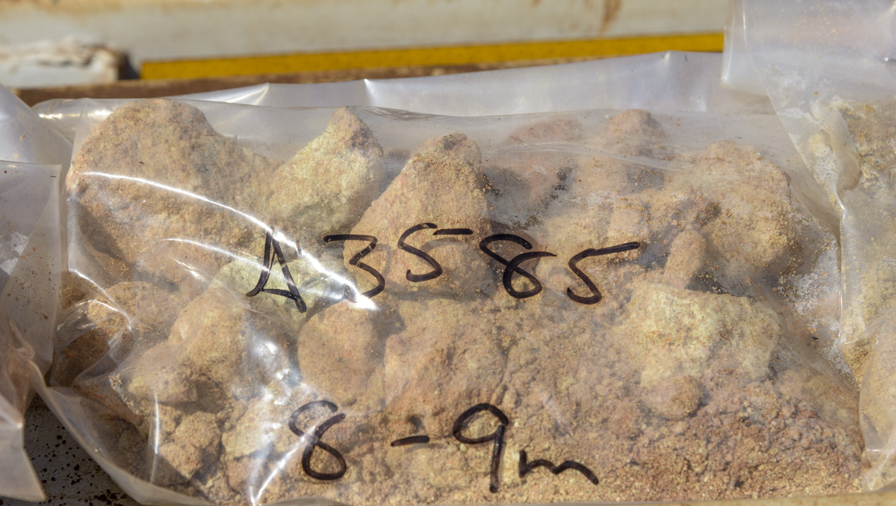 From ground level, the drill will remove one meter of earth with every sampling until it hits the basement rock. Then the drill will keep removing 2–3 meters of basement rock before it stops. The average depth of the drill holes is about 8 meters, and each day the team needs to finish about 70–80 meters of drilling. MRM runs two shifts per day.