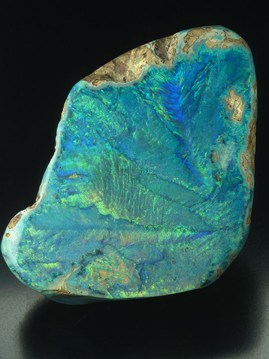 To the northwest of Lightning Ridge are the Queensland boulder opal fields. Boulder opal from Queensland has very bright play-of-color, which makes these stones extremely appealing. The stone is called boulder opal because it is always attached to its host ironstone. Though the sedimentary host rocks are very similar to those in Lightning Ridge, the opal occurs mainly in ironstone concretions or as pipes instead of nobbies. Seam opal can sometimes be found in Queensland fields. Though local miners give the ironstone concretions different nicknames, such as “nuts” or “lily pads,” based on their different shapes, they bear the same concentric internal structure. Opal can be found as the kernel of the “nuts,” between the concentric layers of ironstone or on the surface of the concretions. Certain opalized fossils were also recorded in this area, with plant fossils commonly seen.
