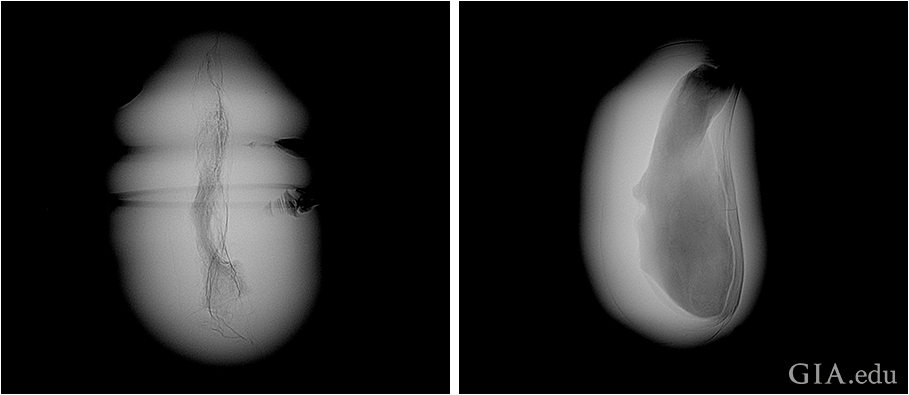 Pearl A-24 (figure 8) showed an elongated void structure with some short cracks branching out at one end of the pearl. An organic-rich “meaty” area surrounds the void feature. Cracks such as these may be observed in NBC and natural pearls, though there are some subtle differences.