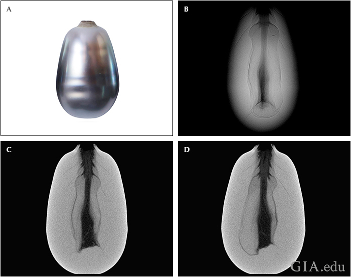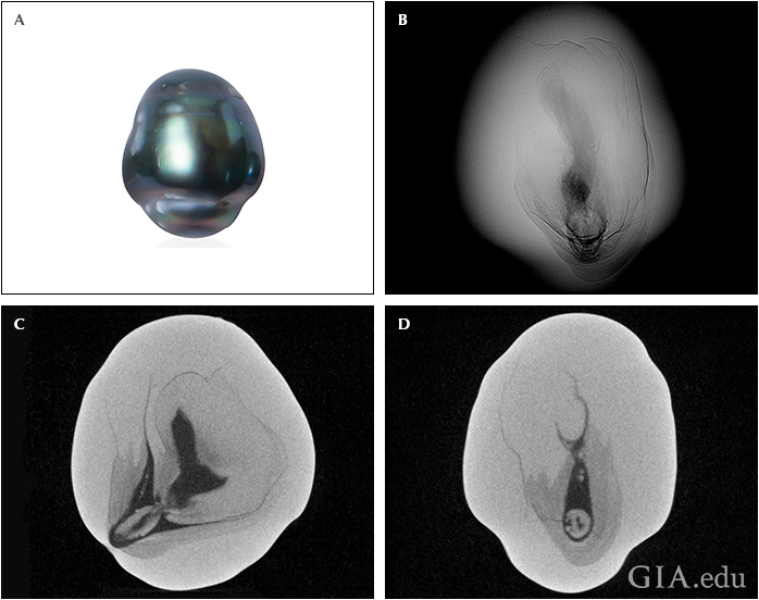 Pearl A-55 (figure 9) showed a fairly large void with some organic matter (a gray feature in the thicker lower area of the RTX image). The void extends upward toward the tapered end and narrows in the central area. Distinct growth arcs may be seen extending from the lower void feature and are also clearly seen following the pearl’s shape toward the tapered end. The structure of this pearl is not as convincing as the others in table 2, but its overall form and external appearance indicate it is more likely an NBC pearl than a natural pearl. GIA would interpret such a structure as NBC.