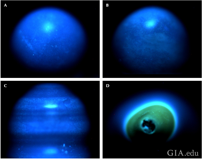 The final test we carried out was to observe the fluorescence reactions of some of the samples in the DiamondView. All twenty-seven (27) samples exhibited a blue reaction over most of their surfaces (figure 30, A and B), with moderate to strong intensity. Some variation, weak to strong blue, was noted in samples possessing uneven or circled surfaces (figure 30C). An organic-rich area on one sample with a non-nacreous surface showed an atypical strong greenish yellow reaction (figure 30D). It is interesting to note that the general moderate to strong blue fluorescence is not influenced by the hue, tone, and saturation in the same way as the results obtained by the other instruments.