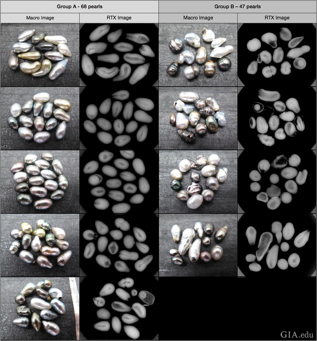The samples from Groups A and B were sorted into smaller groups for RTX analysis owing to the limited field of view (FOV) of the RTX machine. Thus, only a general overview of the structures could be obtained prior to examining the individual NBC pearls in more detail. The group RTX results revealed various types of void and linear structures (table 1) and also identified two pearls from Group A and three pearls from Group B as BC pearls that required no further X-ray analysis.