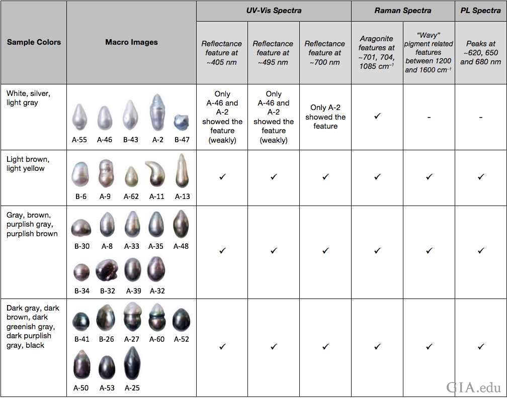Some low-quality saltwater and freshwater pearls may be treated to imitate the colors seen in Tahitian pearls. The identification of their color origin is necessary to separate them from the naturally colored samples. By studying the UV-Vis, Raman and PL spectra of known naturally colored Tahitian cultured pearls, or at least of reportedly known natural coloration, a useful reference database can be created. Previous research and related articles have shown that pearls produced by the Pinctada margaritifera species exhibit characteristic spectroscopic features that conclusively identify their natural color origin and prove they originated from the mollusk species.