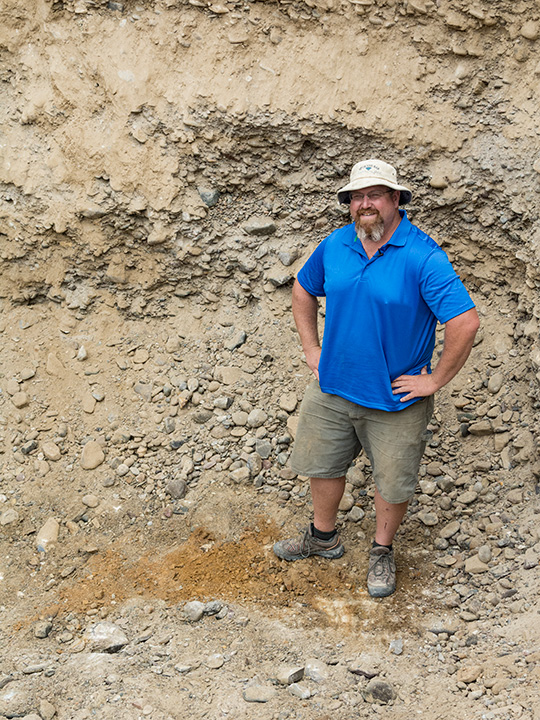 From a cross-section exposed by digging, the sapphire-bearing gravels are clearly visible above the brownish shale bedrock and below a volcanic ash layer of various thicknesses. The thickness of the gravel layers is about 20 feet at this location. Due to the alluvial nature, pebbles are relatively well sorted in the gravel layer. Along with sapphire, topaz, hematite, gold, and fossils can also be found in the gravel. The miners recover as much as they can from the jig at the end of the day. While sapphire is the main target, byproducts like gold also help cover costs.