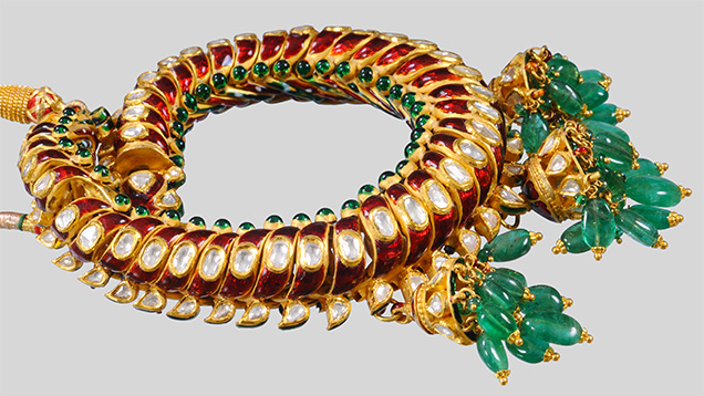 西側諸国ではまだよく知られていないが現代のビジネスやエンターテイメントの大家や王族たちがこぞって求める、マハラジャとそのジュエリーの世界へようこそ。 エナメルを用いたクンダン ミーナ ジュエリーと、見栄えの豪華なポルキ・ダイヤモンドのスタイルで作られている、現代の素晴らしい芸術作品をご覧ください。