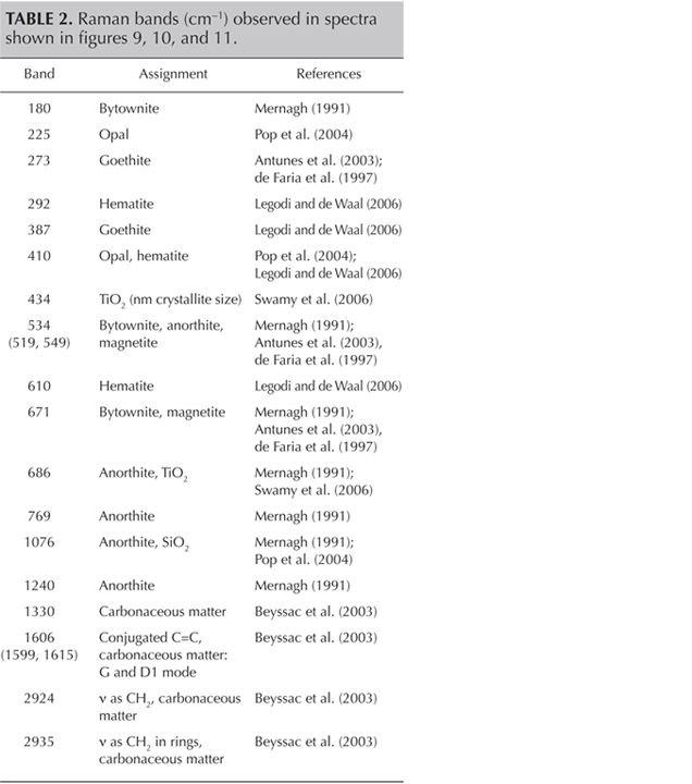 The presence of carbonaceous matter is very clearly marked by 1330 and 1606 cm−1 bands (again, see figure 10). Resolving this second band gives two bands: one at 1599 cm−1, the other a D1 band at 1615 cm−1, forming a shoulder on the G band. These bands are characteristic for graphite and carbonaceous matter. The 1330 cm−1 band (called the D band) is due to disorder-induced first-order Raman mode, and the 1599 cm−1 band to first-order E2g Raman mode (G band); the 1615 cm−1 band is called the D1 band (figure 10, inset, and figure 11; see Beyssac et al., 2003). The D1 band always occurs with the D band, and its intensity increases with a decreasing degree of organization. In the second-order region (2200–3400 cm−1) there also appear weaker peaks, representing poorly organized carbonaceous matter, attributed to overtone or combination scattering (table 2).