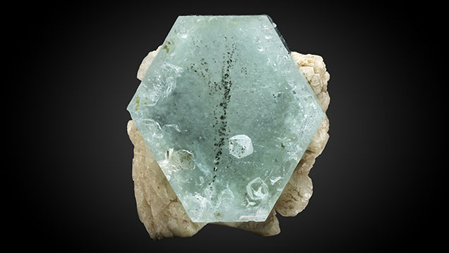 An aquamarine crystal from Pakistan contains a pseudomorphic quartz inclusion.