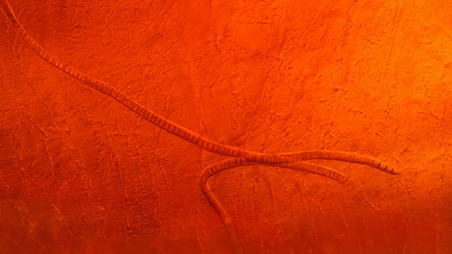 Near-colorless heulandite crystals in an Ethiopian opal resemble the segmented bodies of worms.